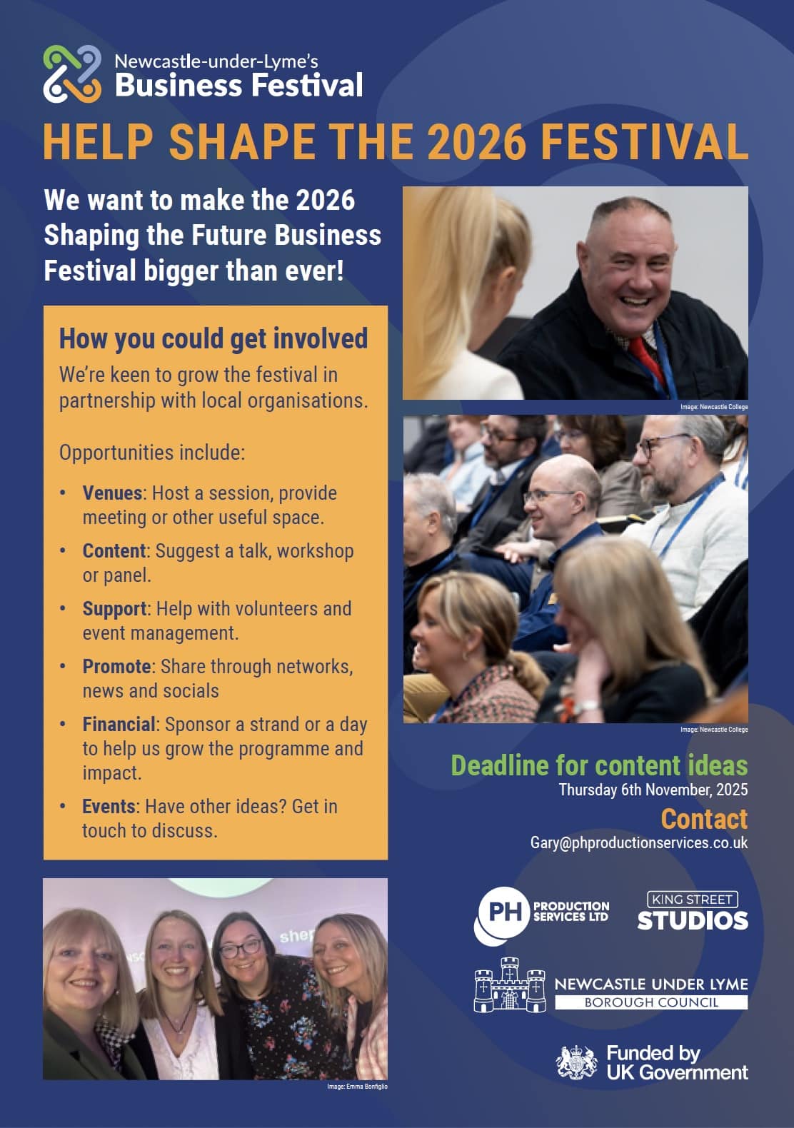 Peter Herbert of PH Productions said: “There was a lot to take away from the first festival, and plenty to learn from. While the festival is about bringing organisations together to connect, it’s about learning and how to grow together to support Newcastle-under-Lyme, which is why we are now are inviting local organisations to come forward and let us know their thoughts on what they would like to see – or do – for the return of the Newcastle-under-Lyme Business Festival – which will take place between 16 – 20 March, 2026.”